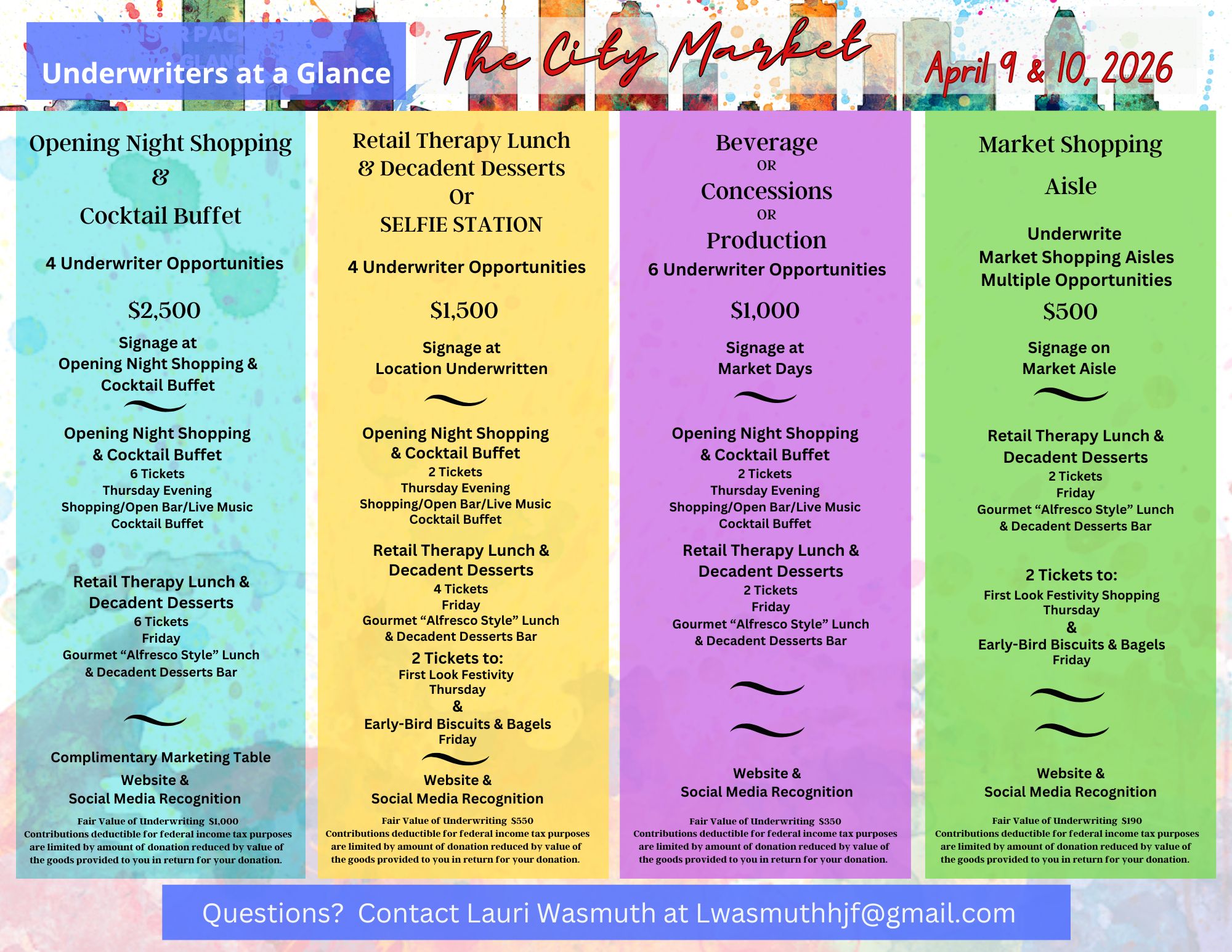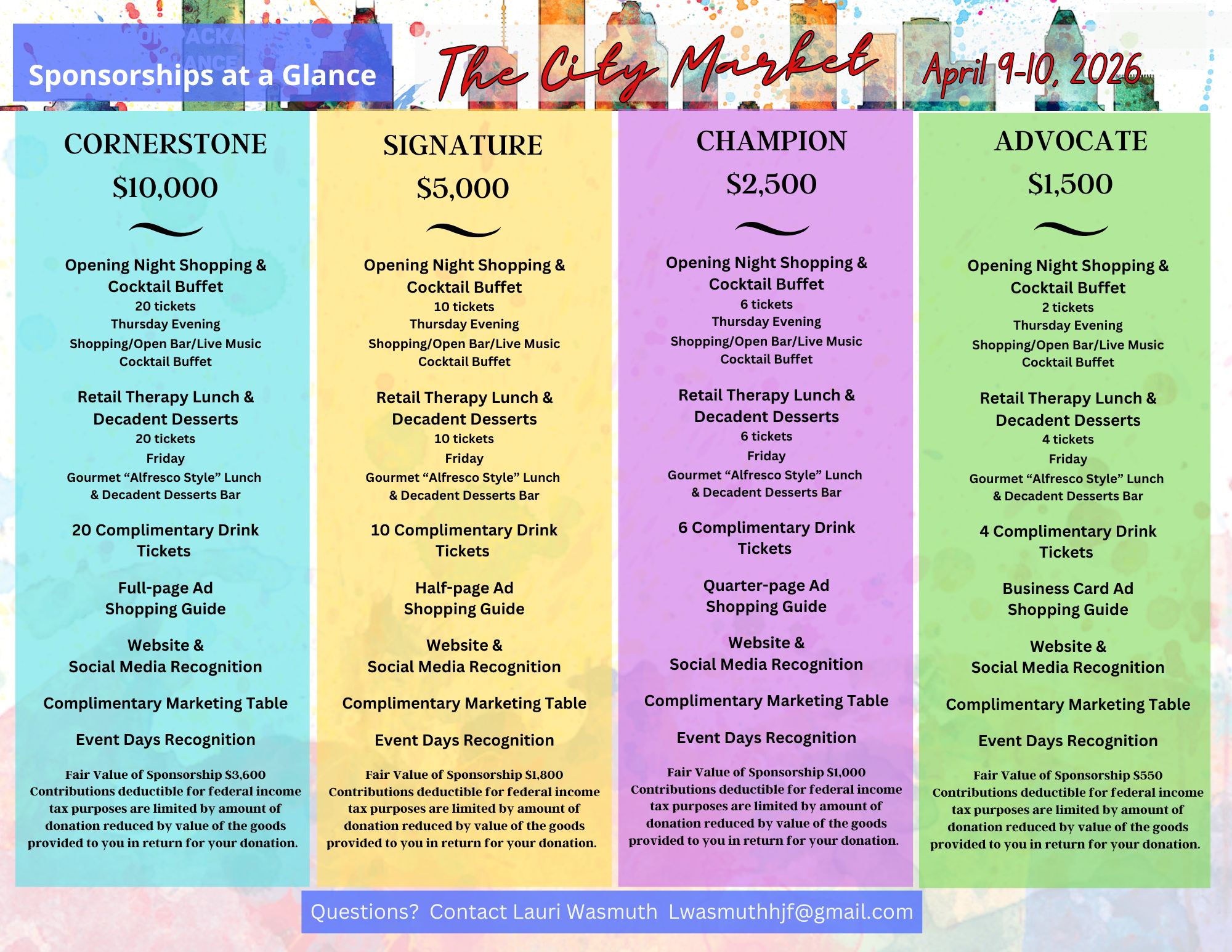 The Houston Junior Forum warmly invites you to support our charitable programs by donating, sponsoring or underwriting a feature at The City Market. By participating, you or your company will receive recognition at the event, be highlighted in The City Market Shopping Guide, acknowledged on social media, and listed on The City Market website. Depending on your level of support, sponsor or underwriter packages may include passes to Ticketed Special Events for your clients, friends, and family. The City Market organizers anticipate over two thousand shoppers attending the market, engaging in the Ticketed Special Events, and exploring the unique offerings from more than 70 handpicked market vendors.